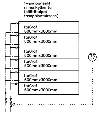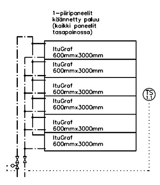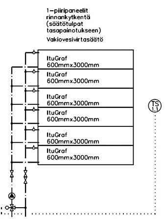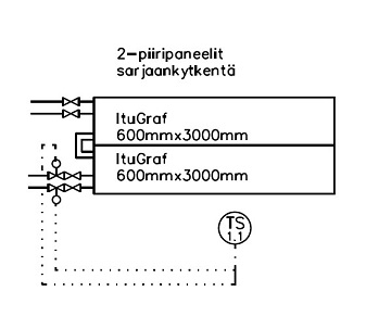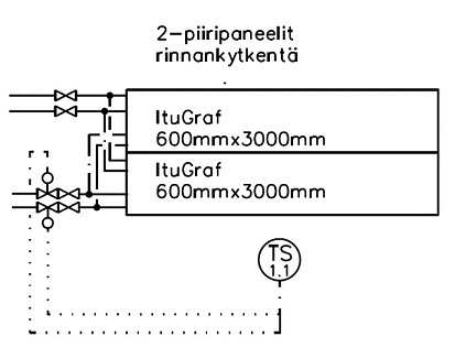 Jäähdytykseen tarvitaan 2kpl ja lämmitykseen 1kpl paneeleita. Näin toimistohuoneessa voidaan käyttää 1kpl 1-piiristä paneelia jossa pelkkä jäähdytys ja 1kpl 2-piiristä paneelia jossa sekä lämmitys että jäähdytys (jäähdytys kytketään alempaan putkipiiriin).