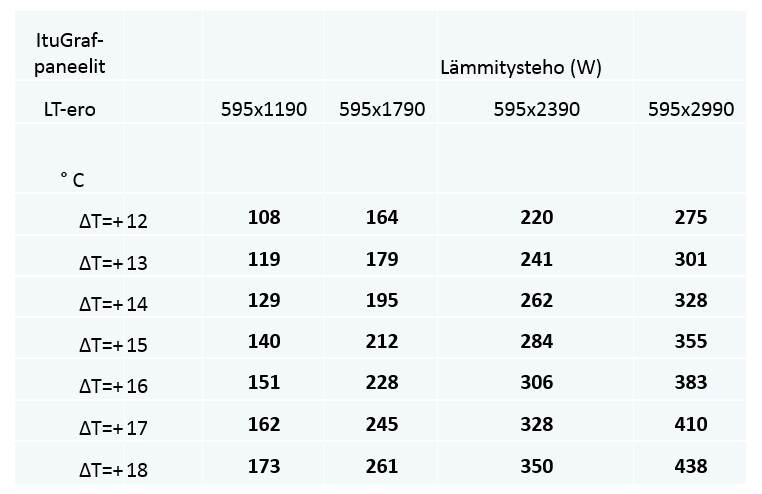 Grafiittiväliaineen avulla ItuGraf-paneelipinta on lähes kokonaisuudessaan, noin 95 %, aktiivista niin lämmityksessä kuin jäähdytyksessäkin. Kattosäteilypaneeleissa käytetään mitoituksessa testilaboratoriossa mitattuja arvoja. Kooltaan tietynlainen paneeli luovuttaa huonetilaan tehon, joka määräytyy paneelin meno- ja paluuveden keskiarvolämpötilan erotuksena huonelämpötilaan. Alla olevassa taulukoissa 3 ja 4 näkyy esimerkinomaisesti mitä erikokoiset ItuGraf –paneelit luovuttavat tehoa eri yli- ja alilämpötiloilla.