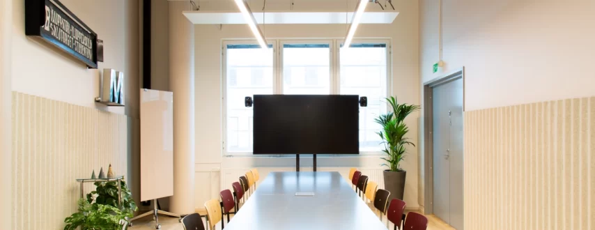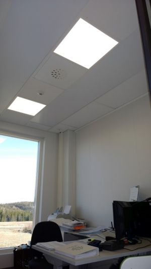 Alla on esimerkki paneelien asemoinnista toimistohuoneeseen. Ne voidaan kiinnittää kattoon vaijereilla vapaasti roikkumaan tai integroida alakattoon mikäli sellainen tulee toimistoon.