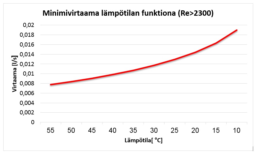 Jäähdytyksessä virtaama on 0,025 l/s (paneelia kohti) ja lämmityksessä 0,017 l/s. Tarkastetaan turbulenttisuuden täyttyminen taulukosta 1 ja todetaan, että turbulenttisuus täyttyy.