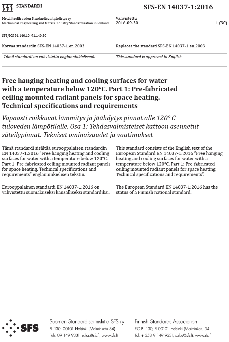 SFS-EN 14037-1:2016. Vapaasti roikkuvat lämmitys ja jäähdytys pinnat alle 120°C tuloveden lämpötilalle. Osa 1: Tehdasvalmisteiset kattoon asennetut säteilypinnat. Tekniset ominaisuudet ja vaatimukset.