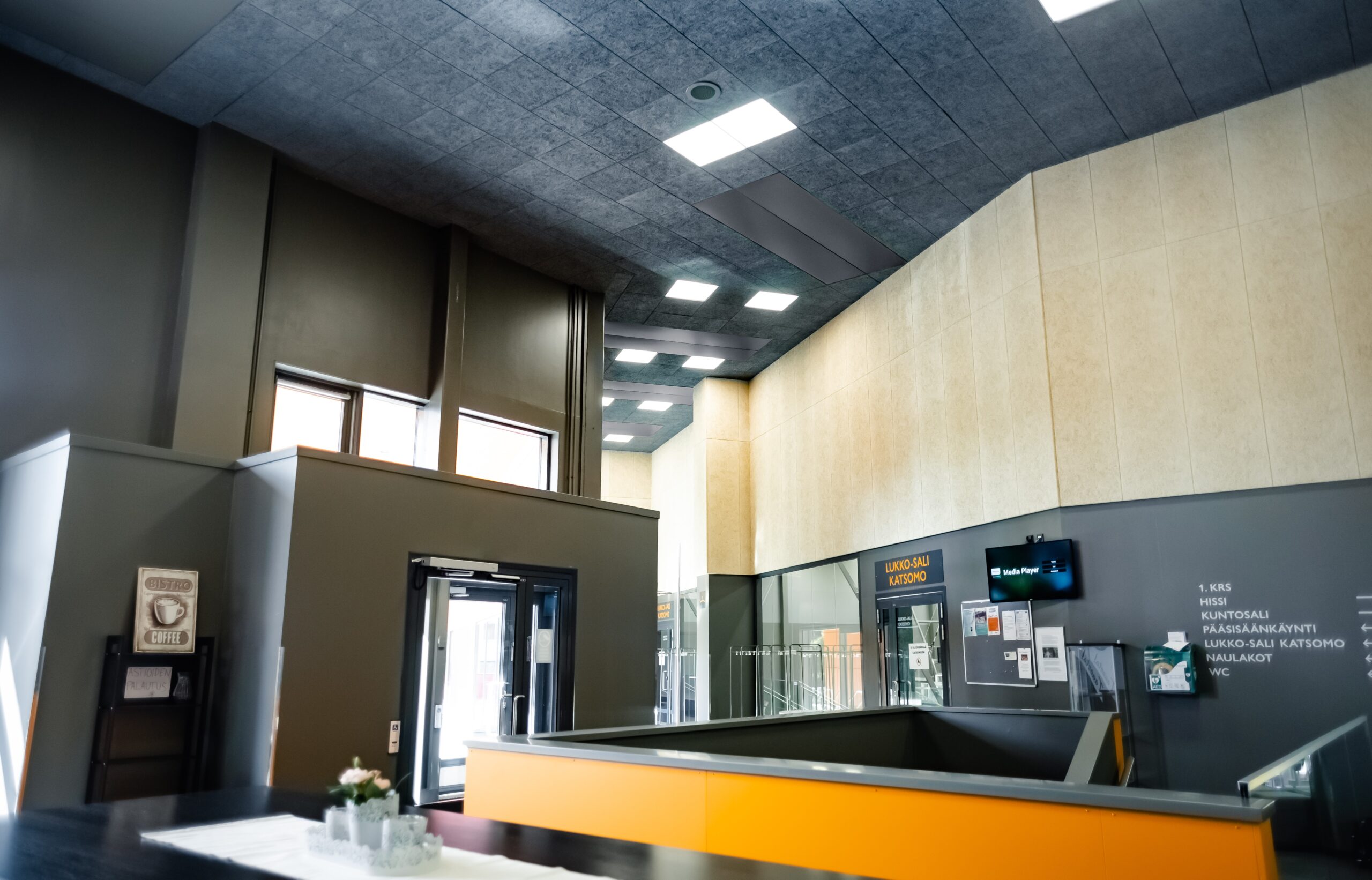 Aula- ja käytävätiloihin sekä kuntosalille on valittu erityyppinen, yleisesti toimisto- ja asuinrakennuksissa käytetty kattosäteilyjärjestelmä. Tyylikkään harmaaksi maalatut ItuGraf-paneelit integroituvat alakattoon lähes huomaamattomasti. ItuGraf-paneeli on räätälöitävissä lukuisilla eri tavoilla asiakkaan toiveen mukaisesti. Asiakas voi valita paneelin koon ja värin lisäksi esimerkiksi haluamansa alakattomallin ja paneeliin integroitavat valaisimet.