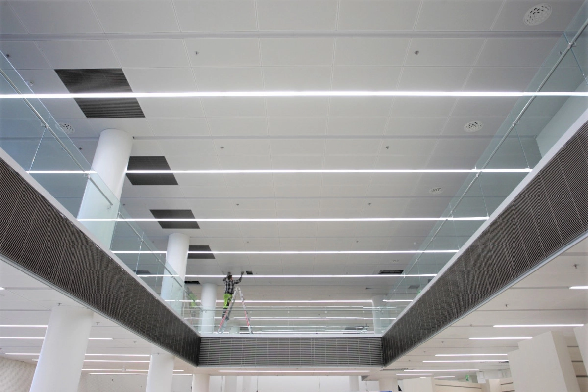 -Tehtaanmyymälään asennetut paneelit ovat ripustettuja ratkaisuja, muualla Itulan kattosäteilijät on upotettu alakattoihin lähes huomaamattomasti, kertoo pääurakoitsijan työmaapäällikkö Pasi Mattila.