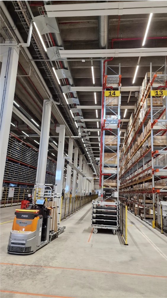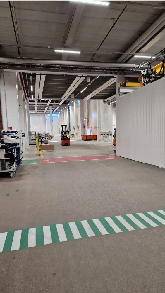 Logistiikkakeskuksessa tehdään jatkuvaa keräilyä ja täydennystä keskukseen välittömästi liittyvään traktorituotantohalliin. Myös siirtymäalue on varustettu ItuString+ paneeleilla.